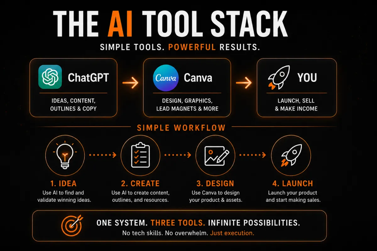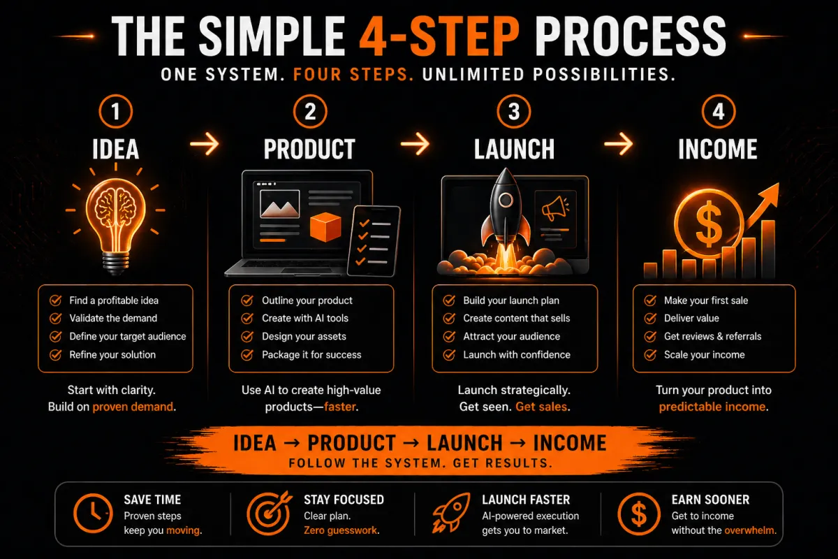 Stop overthinking. Follow a simple system that takes you from idea → product → income using AI.